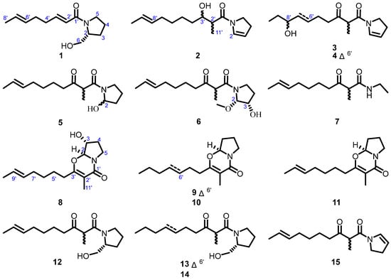 Five known compounds were identified as (–)-penicilactam A (11), scalusamides A–C (12–14) and N-(2-methyl-3-oxodec-8-enoyl)-2-pyrroline (15), by comparing their physicochemical and spectroscopic data with the reference data [,,,].