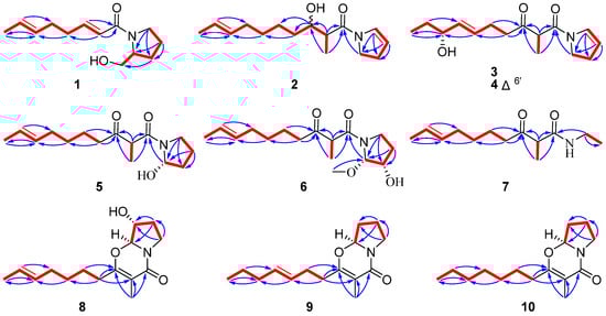Key 1H-1H COSY (red bold) and HMBC (blue arrows) correlations of compounds 1–10.