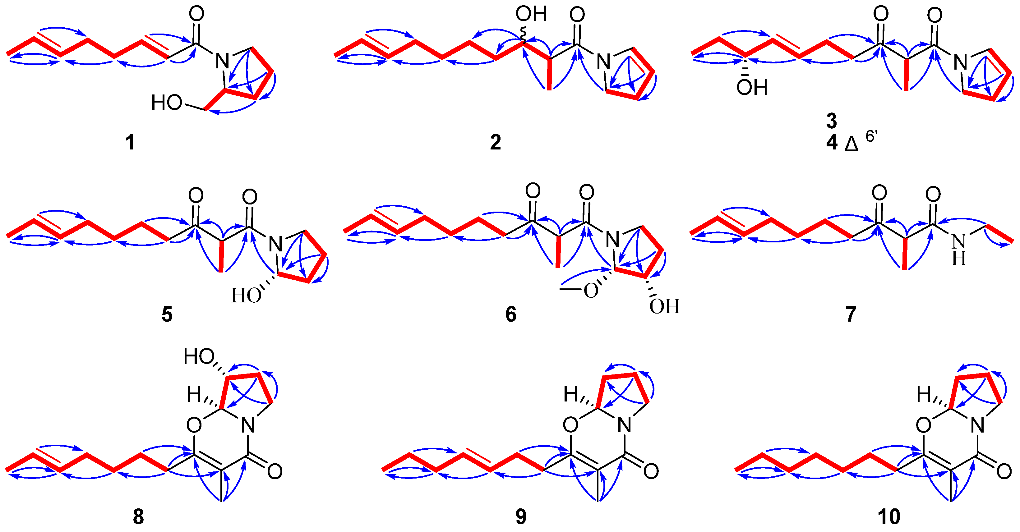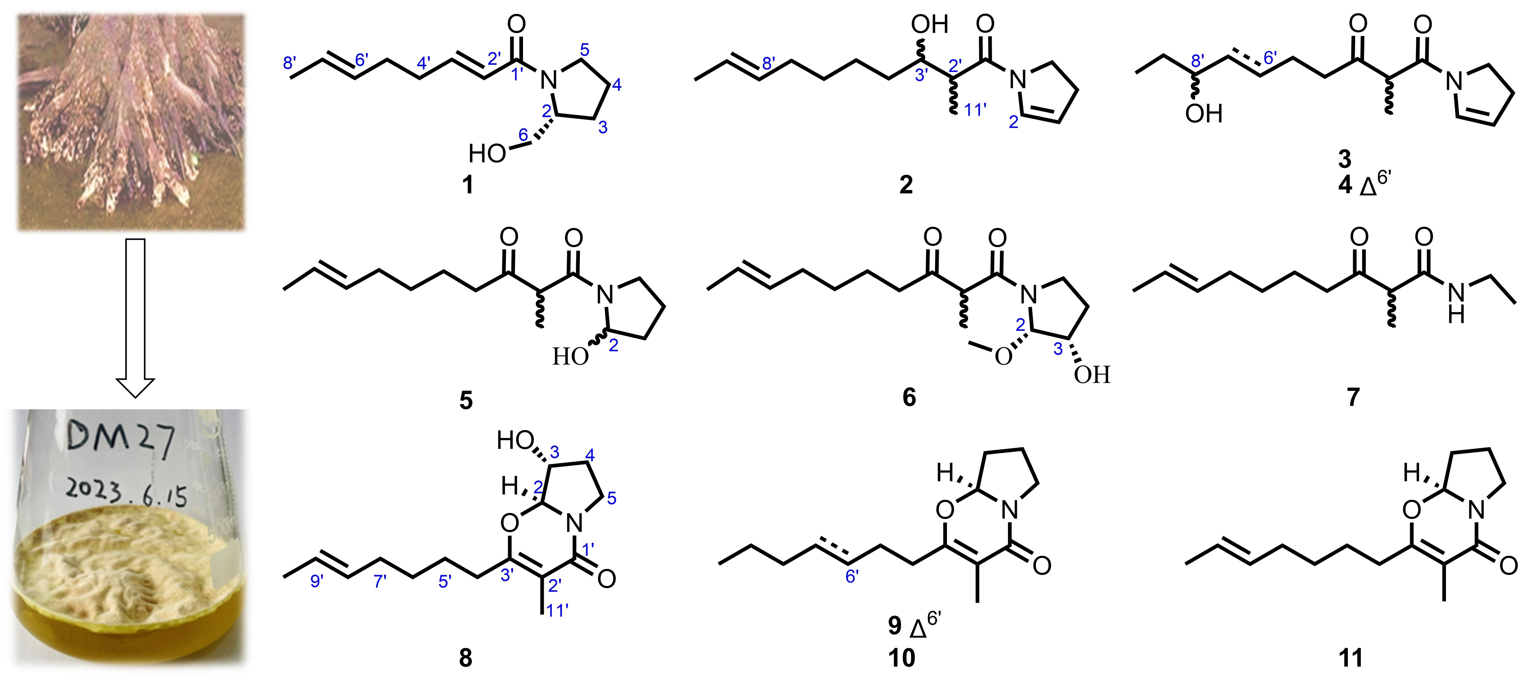 - Chen, Z.; Zhang, J.; Huang, C.; Chen, W.; He, L.; Tang, Q.; Zhu, K.; Li, J.; Gao, P.; Zhang, M.; et al. Penicipyrrolizidinones A-C, three pyrrolizidinone alkaloids with unprecedented skeletons from the mangrove-derived fungus Penicillium sp. DM27. Phytochemistry 2025, 229, 114273. [Google Scholar] [CrossRef]