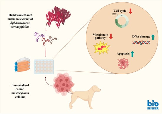 Mucignat, G.; Lakhdar, F.; Maghrebi, H.; Dejnaka, E.; Lucatello, L.; Benhniya, B.; Capolongo, F.; Etahiri, S.; Pauletto, M.; Pawlak, A.; et al. Anti-Cancer Activity of Sphaerococcus coronopifolius Algal Extract: Hopes and Fears of a Possible Alternative Treatment for Canine Mast Cell Tumor. Mar. Drugs 2025, 23, 457. https://doi.org/10.3390/md23120457