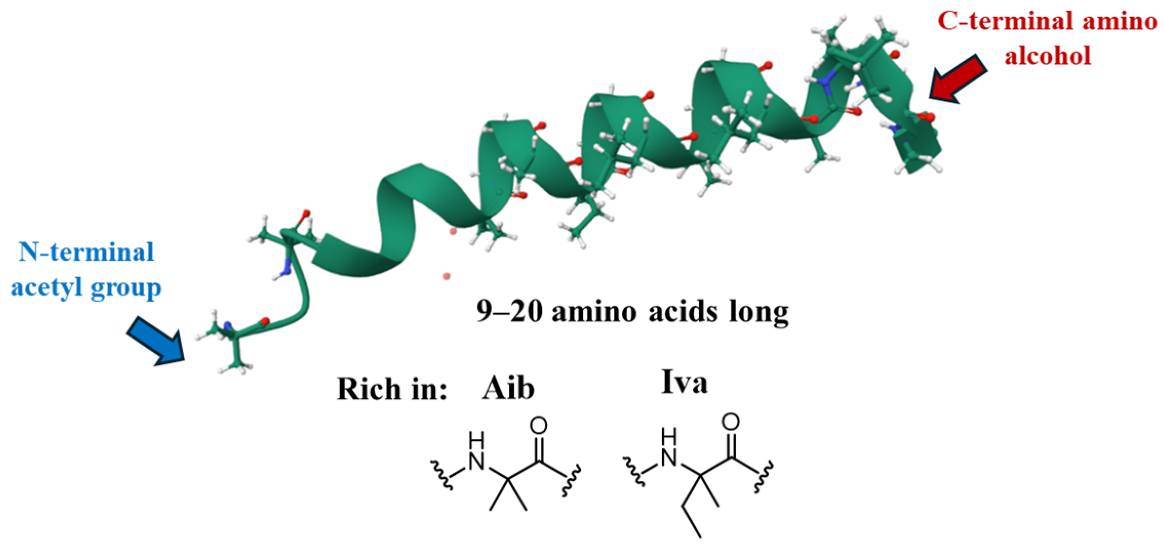 - Turaga, V.N.R. Peptaibols: Antimicrobial Peptides from Fungi. In Bioactive Natural products in Drug Discovery; Springer: Berlin/Heidelberg, Germany, 2020; pp. 713–730. [Google Scholar] [CrossRef]
