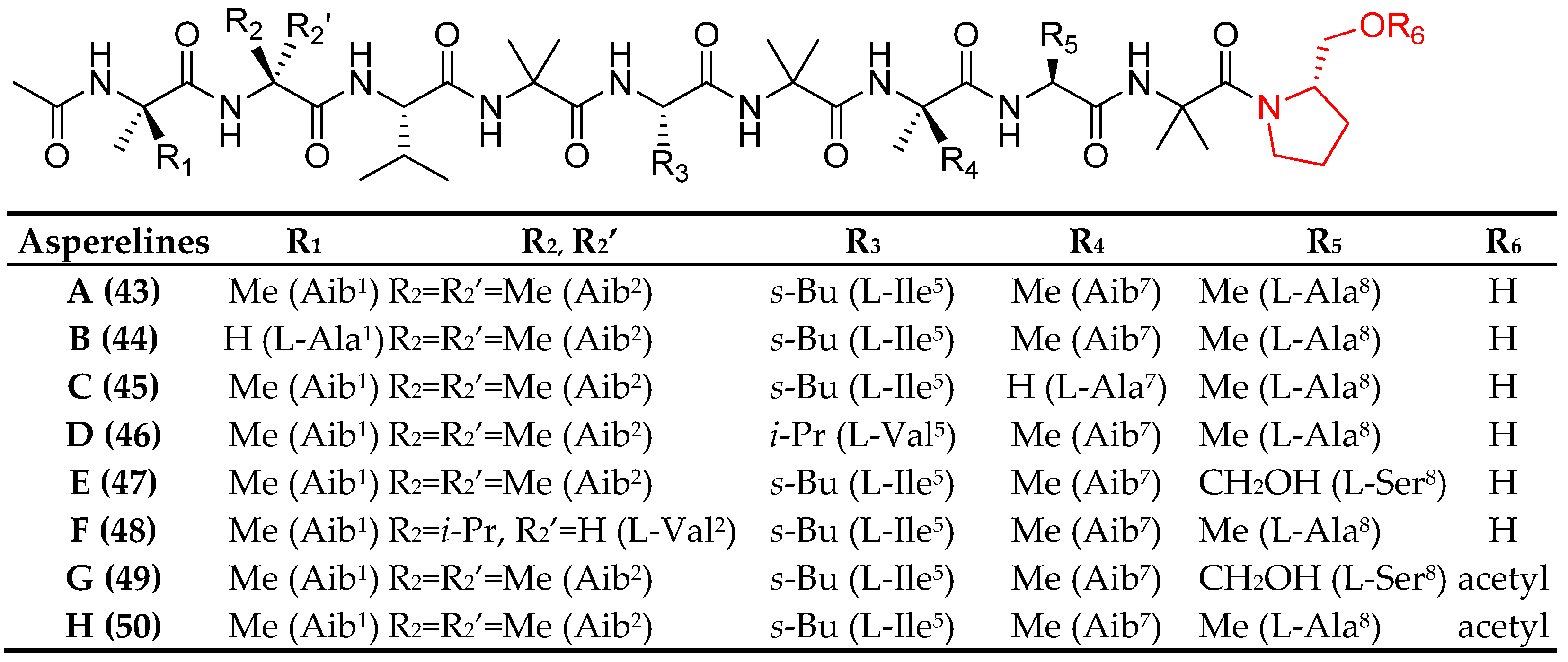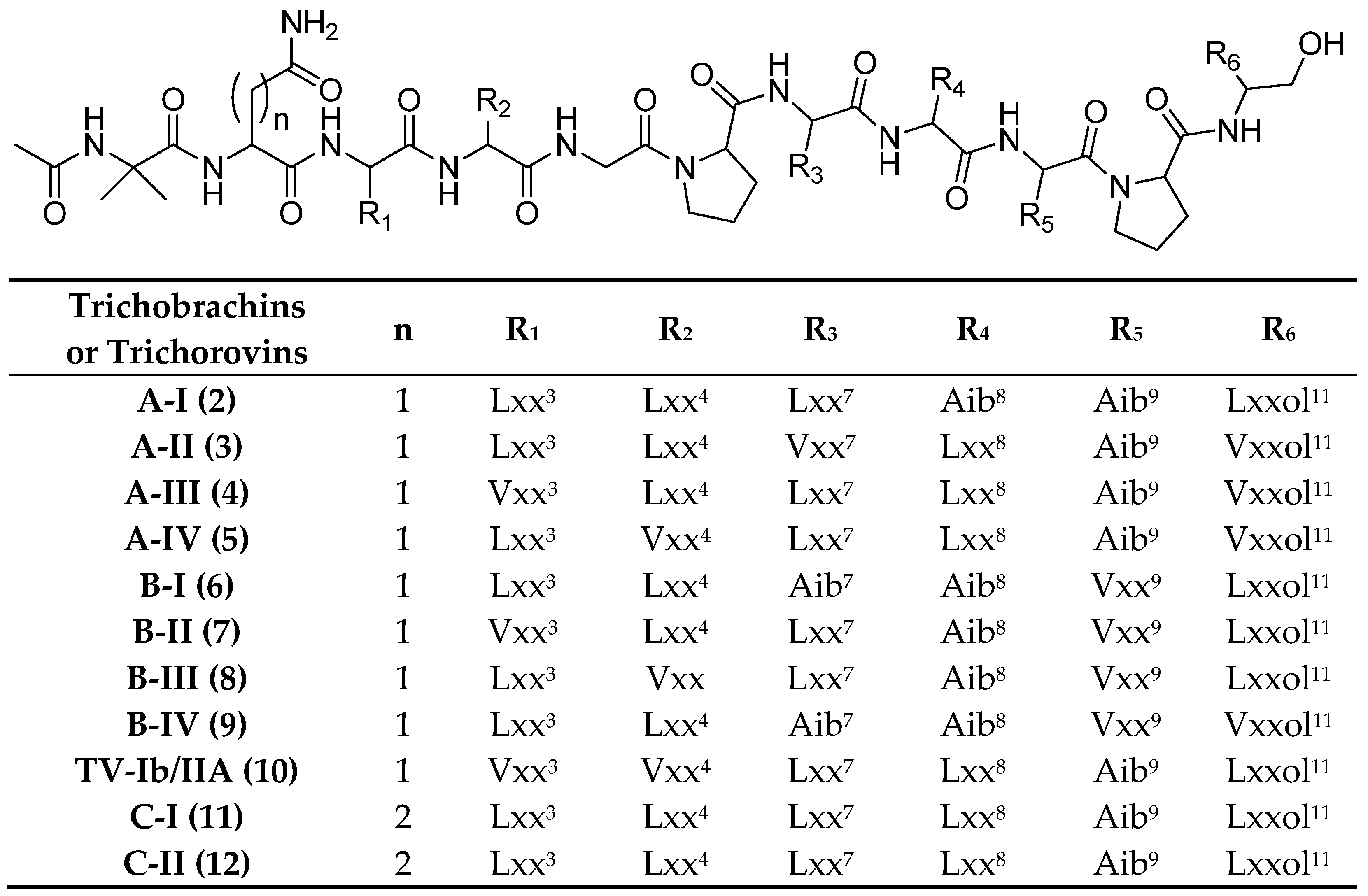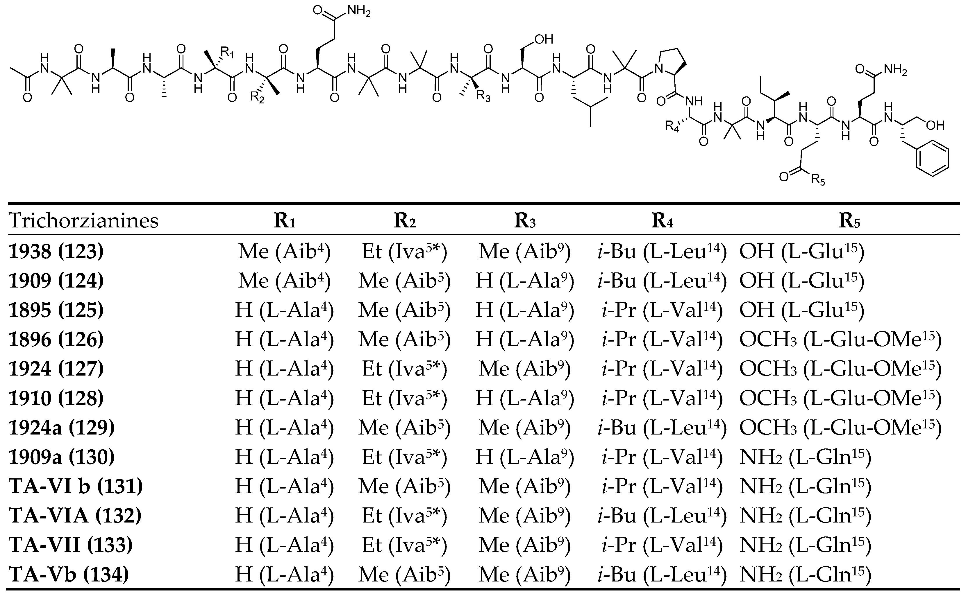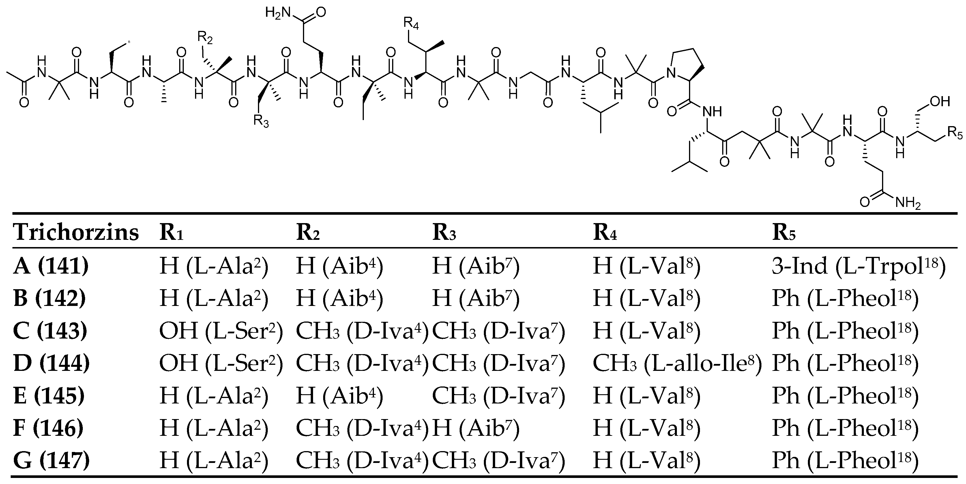 | TA-19A-I a (119) | Ac-Aib1-Ala2-Ala3-Aib4-Aib5-Gln6-Aib7-Aib8-Aib9-Ala10-Lxx11-Aib12-Pro13-Vxx14-Aib15-Lxx16-Gln17-Gln18-Pheol19 |