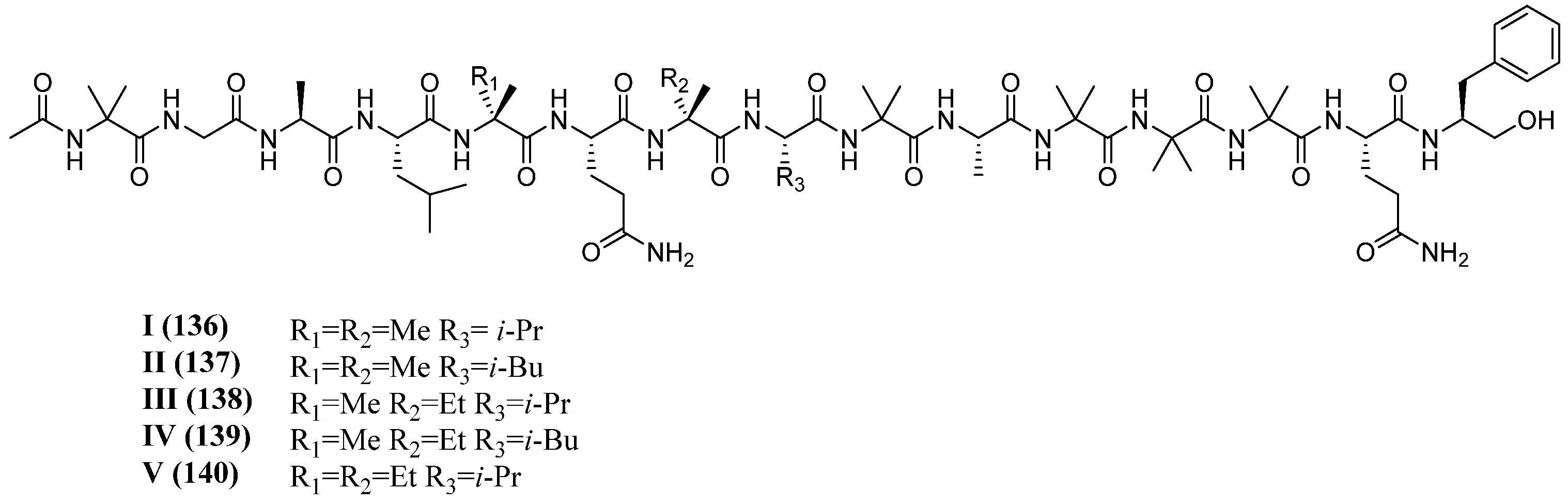 | TA-17S-III c (118) | Ac-Ala1-Aib2-Ala3-Aib4-Vxx5-Gln6-Aib7-Aib8-Aib9-Ser10-Lxx11-Aib12-Pro13-Lxx14-Aib15-Lxx16-[C129]17 |
