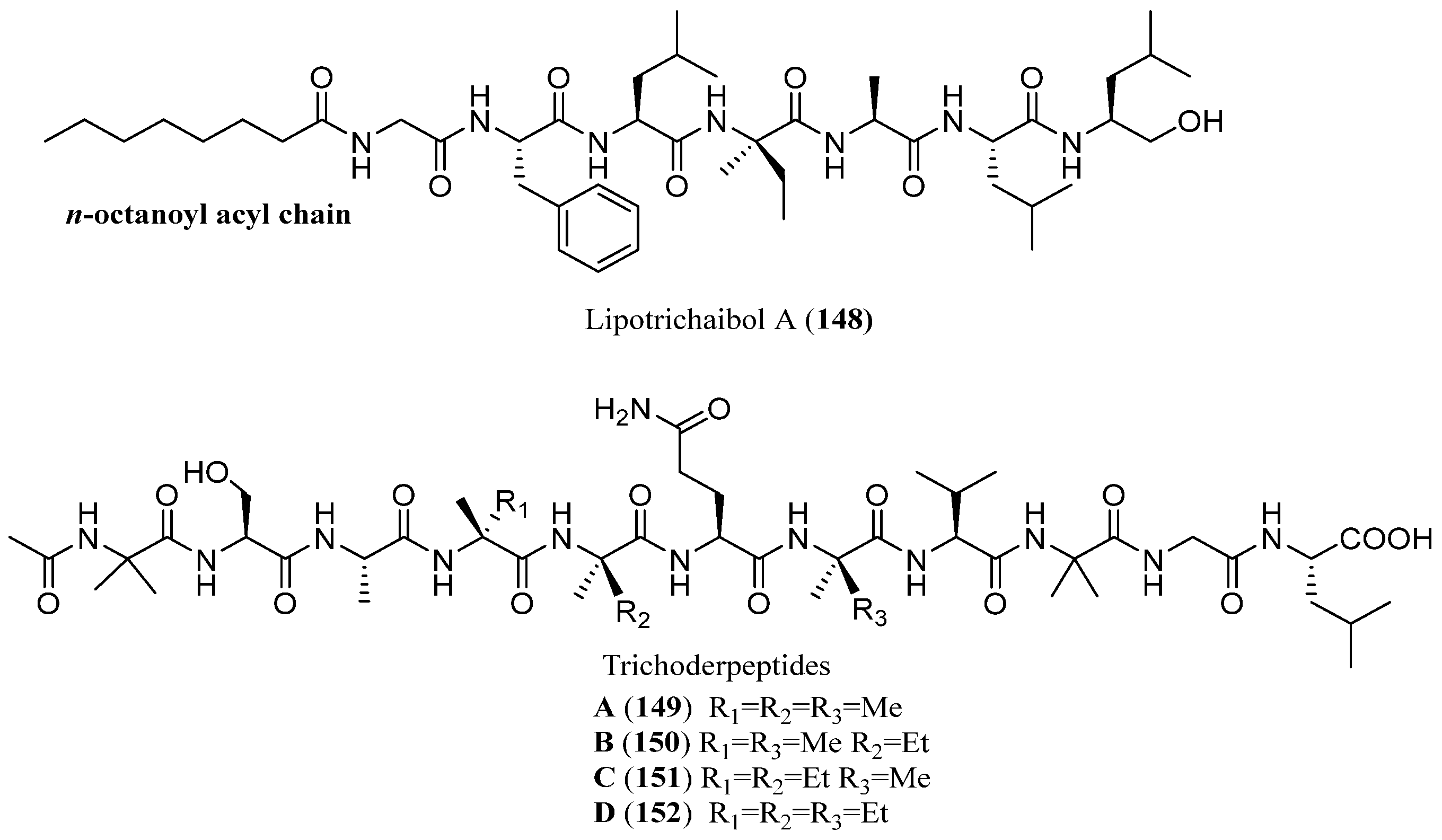 | Trichoderpeptides A–D | 149–152 | Trichoderma sp. (GXIMD 01001) | Sponge | - | [88] |