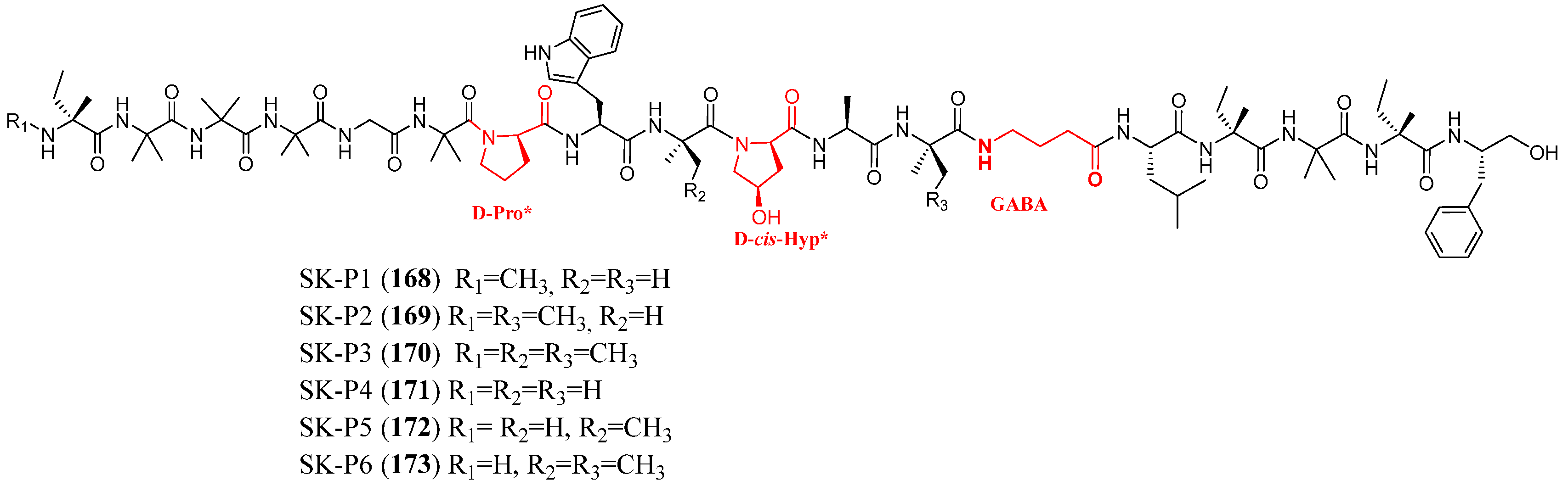 | TA-17A-I c (92) | Ac-Ala1-Ala2-Ala3-Aib4-Aib5-Gln6-Aib7-Aib8-Aib9-Ala10-Lxx11-Aib12-Pro13-Vxx14-Aib15-Lxx16-[C129]17 |