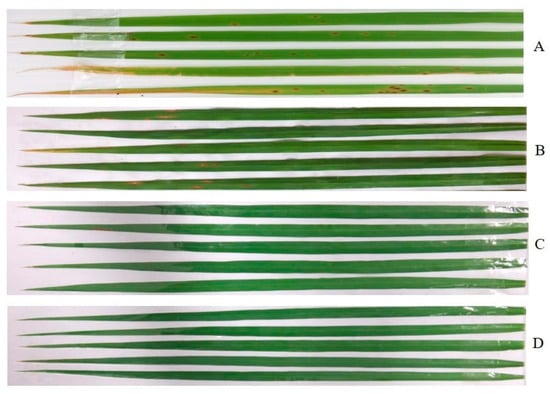 Effects of the crude extract of A. unguis KUFA 0098 against brown leaf spot disease under greenhouse conditions when applied before pathogen inoculation. A = control; B = 1000 µg/mL; C = 5000 µg/mL; and D = 10,000 µg/mL.