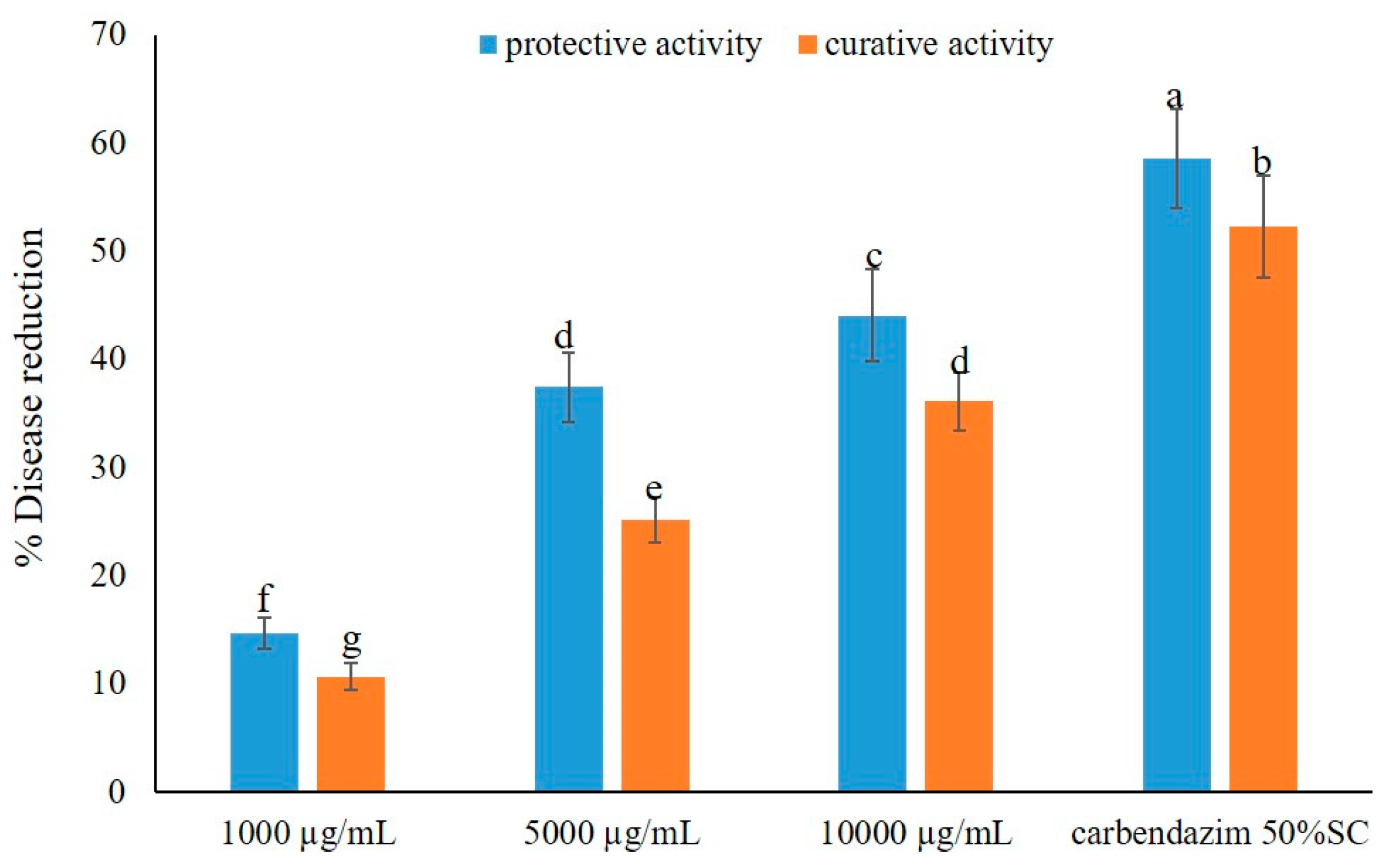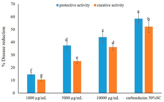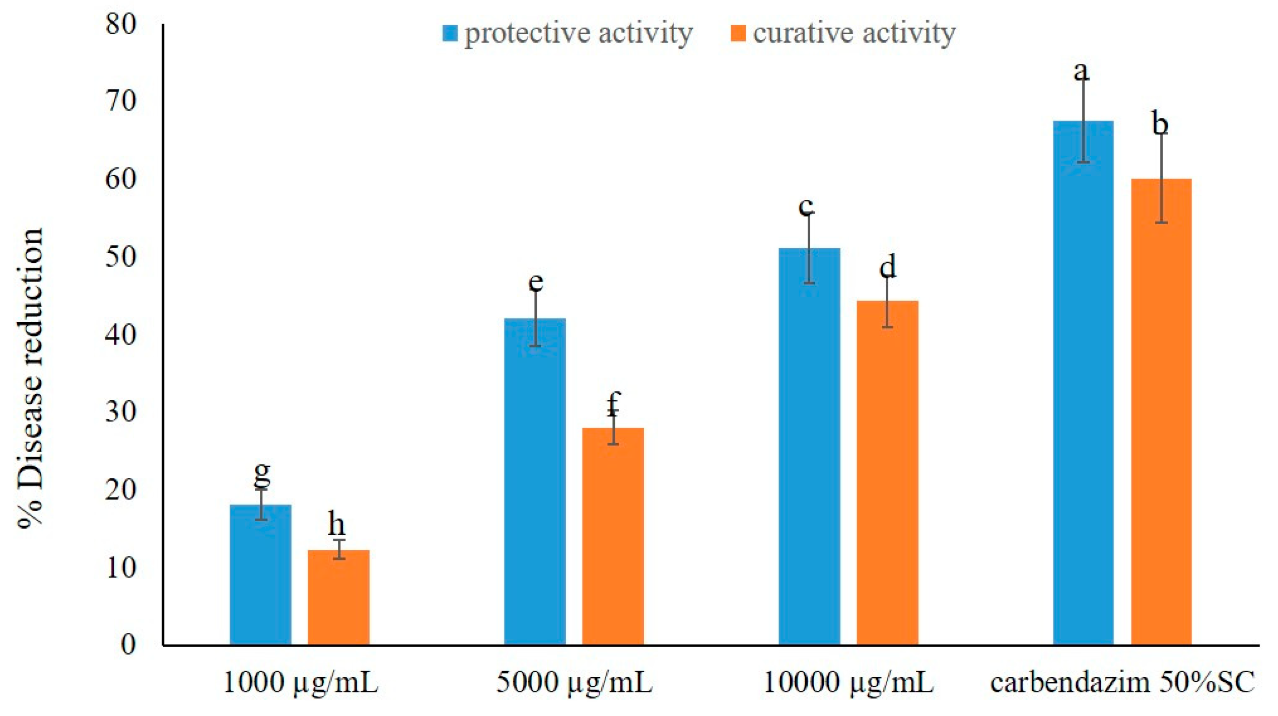 For the evaluation of the curative activity, the 30-day-old rice plants were first inoculated with 30 mL of spore suspension (containing 1% Tween 80) of B. oryzae at 106 spores/mL/pot. Then, each pot was covered with a transparent plastic bag for 24 h, after which the rice plants were sprayed with the crude extract solutions at 1000 µg/L, 5000 µg/L, and 10,000 µg/L, 30 mL per pot. Distilled H2O and aqueous solution of carbendazim 50% W/V SC, at 1.5 mL/L, both containing 1% Tween 80, served as negative and positive controls, respectively. Each treatment consisted of five pots (two replications) with two repetitions.