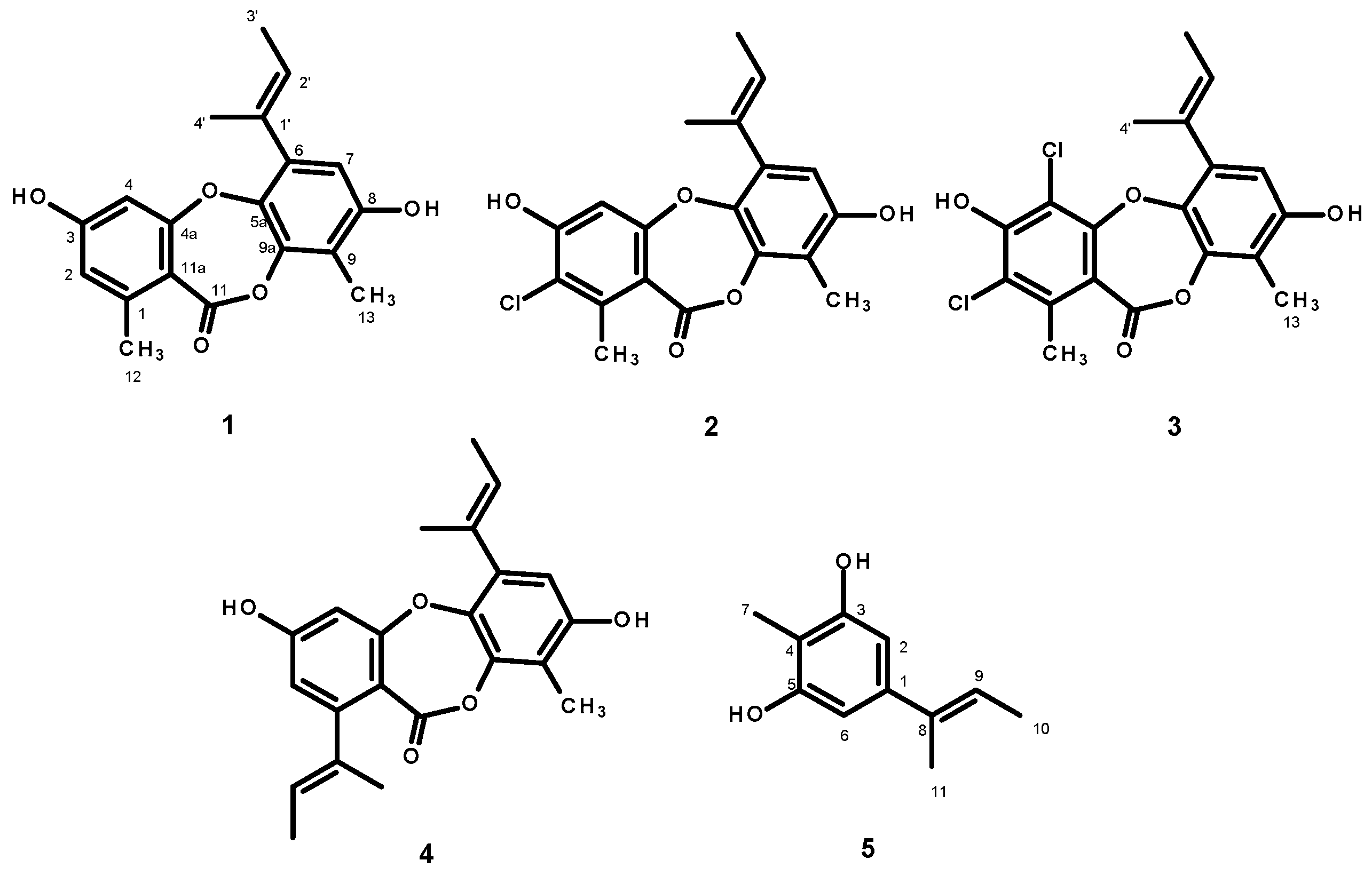 Interestingly, the introduction of bulky groups to the depsidone scaffold slightly affected the growth-inhibitory activity of the depsidones since 4, an analog of 1, with the but-2-en-2-yl group on C-1 and the methyl group on C-4, displayed a similar growth-inhibitory activity to that of 1, except for A. brassicicola and C. oryzae. On the other hand, the introduction of a chlorine atom to C-2 of 1 dramatically decreased its growth-inhibitory activity, as evidenced by the lack of activity of 2 against all the phytopathogenic fungi tested. It is interesting to note that all of the three depsidones did not inhibit the growth of three phytopathogenic fungi, viz. L. theobromae, R. oryzae, and S. roflsii.
