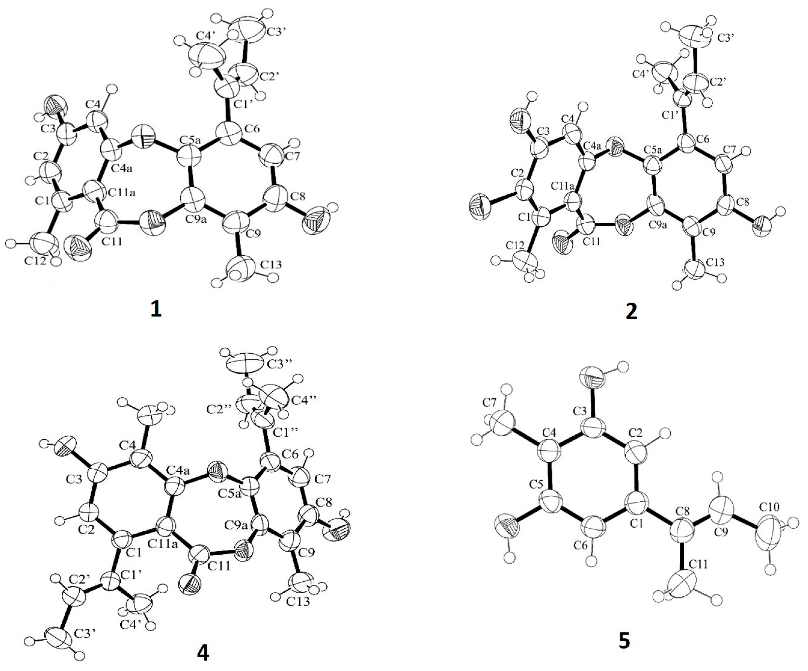 The mycelial plugs of A. unguis KUFA 0098 were transferred into 500 mL Erlenmeyer flasks containing 200 mL of potato dextrose broth (PDB) and incubated at room temperature on a rotary shaker at 120 rpm for 7 d to prepare mycelial suspension. Fifty 1 L Erlenmeyer flasks, each containing 300 g of sterile cooked rice, were then inoculated with 20 mL of mycelial suspension in each flask and incubated at room temperature for 30 d, after which 500 mL of EtOAc was added to each flask and macerated for 7 d and then filtered with filter paper (Whatman No.1) to produce the organic solutions, which were combined and evaporated under reduced pressure to furnish a crude EtOAc extract (300 g). The crude EtOAc extract was then dissolved in EtOAc (300 mL) and washed with H2O (3 × 500 mL), and the EtOAc solution was dried over anhydrous Na2SO4, filtered, and evaporated under reduced pressure to obtain 270.2 g of the crude EtOAc extract. The crude EtOAc extract was then dissolved in 500 mL of CHCl3 and filtered. The CHCl3 solution was evaporated under reduced pressure to obtain 157.3 g of a crude CHCl3 extract. The crude CHCl3 extract was applied on a column of silica gel (400 g) and eluted with mixtures of petrol/CHCl3 and CHCl3/Me2CO, wherein 250 mL fractions (Frs) were collected as follows: Frs 1–83 (CHCl3–petrol, 7:3), 84–184 (CHCl3–petrol, 9:1), 185–186 (CHCl3), 187–232 (CHCl3-Me2CO, 9:1), and 233–255 (CHCl3-Me2CO, 8:2). Frs 87–115 were combined (4.42 g) and crystalized in CHCl3 to give 1.21 g of 2. Frs.116–146 were combined (4.45 g) and crystalized in CHCl3 to give 1.18 g of white crystals of 2. Frs. 147–184 were combined (2.31 g) and crystalized in CHCl3 to give 912.2 mg of 2. Frs. 185–191 were combined (1.12 g) and crystalized in CHCl3 to give 543.8 mg of 2. The mother liquor of Frs 87–115 (3.35 g) was applied on a column chromatography of silica gel (30 g) and eluted with mixtures of petrol and CHCl3, wherein 150 mL subfractions (sfrs) were collected as follows: sfrs 19–41 (CHCl3–petrol, 3:7), sfrs 42–46 (CHCl3–petrol, 3:7), sfrs 47–53 (CHCl3–petrol, 3:7), sfrs 54–61 (CHCl3–petrol, 3:7), sfrs 62–79 (CHCl3–petrol, 5:5), sfrs 80–87 (CHCl3–petrol, 7:3), and sfrs 88–99 (CHCl3–petrol, 9:1). Sfrs 62–87 were combined (383.6 mg) and purified by preparative TLC of silica gel G254 and eluted with CHCl3-Me2CO-petrol, 90:5:5, to produce 12.2 mg of 3. The mother liquor of frs.116 was applied on a column chromatography of silica gel (30 g) and eluted with mixtures of petrol and CHCl3, wherein 150 mL sfrs were collected as follows: sfrs 5–14 (CHCl3–petrol, 3:7), sfrs 15–68 (CHCl3–petrol, 3:7), sfrs 69–79 (CHCl3–petrol, 5:5), and Sfrs 80–92 (CHCl3–petrol, 7:3). Sfrs 5–41 were combined and crystallized in CHCl3 to give 483.3 mg of 5. Frs. 192 and 193 were combined (9.54 g) and crystalized in CHCl3 to give 3.28 g of 4. Frs 194–198 were combined (7.25 g) and crystallized in CHCl3 to give 4.64 g of 1.