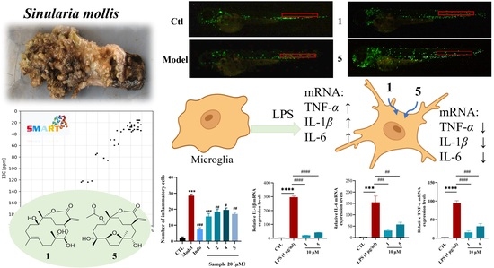 Hou, H.; Li, P. SMART-Guided Isolation and Identification of Seven-Membered Cembranolides with Anti-Inflammation Activity from the Soft Coral Sinularia mollis. Mar. Drugs 2025, 23, 465. https://doi.org/10.3390/md23120465