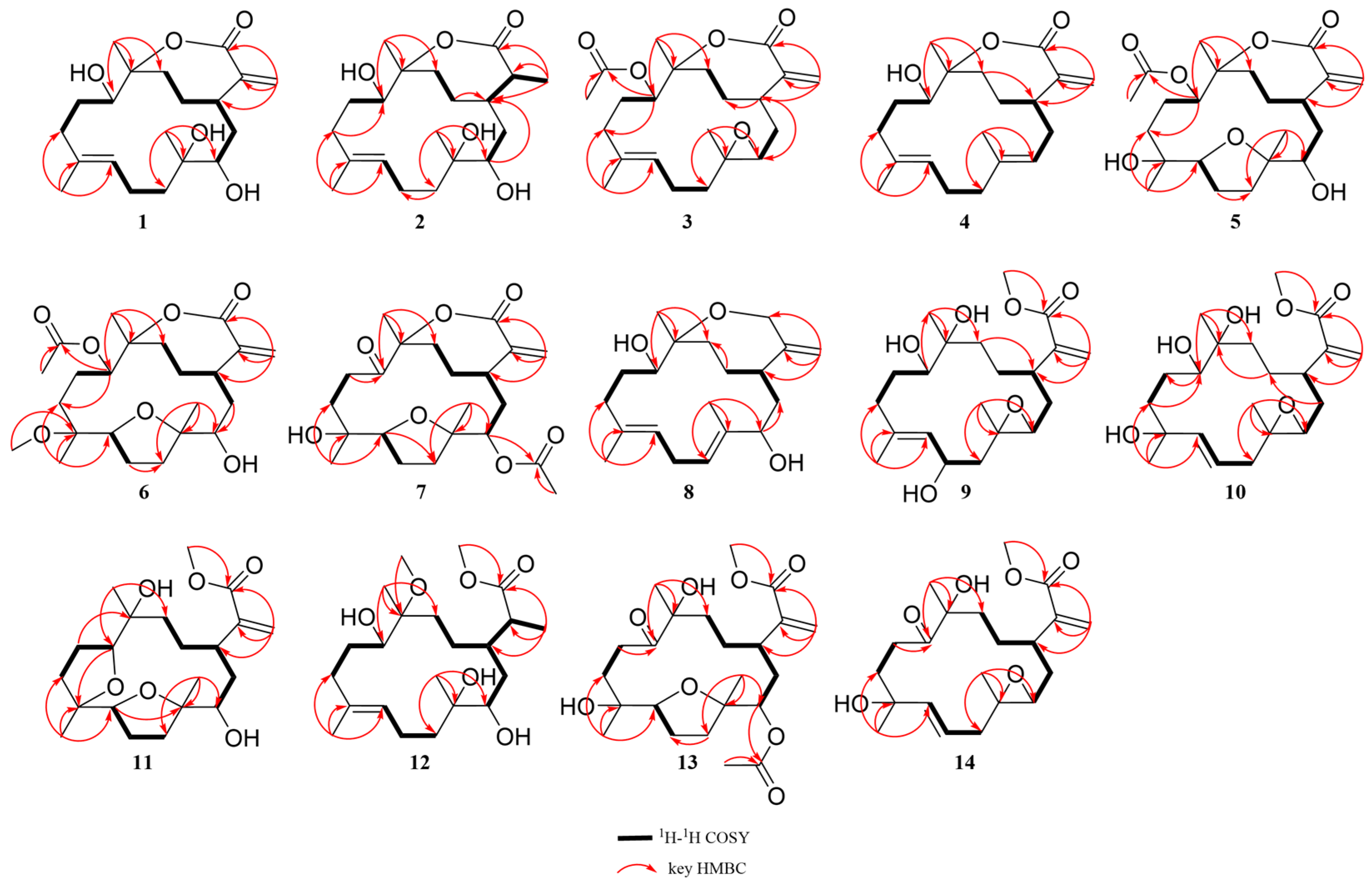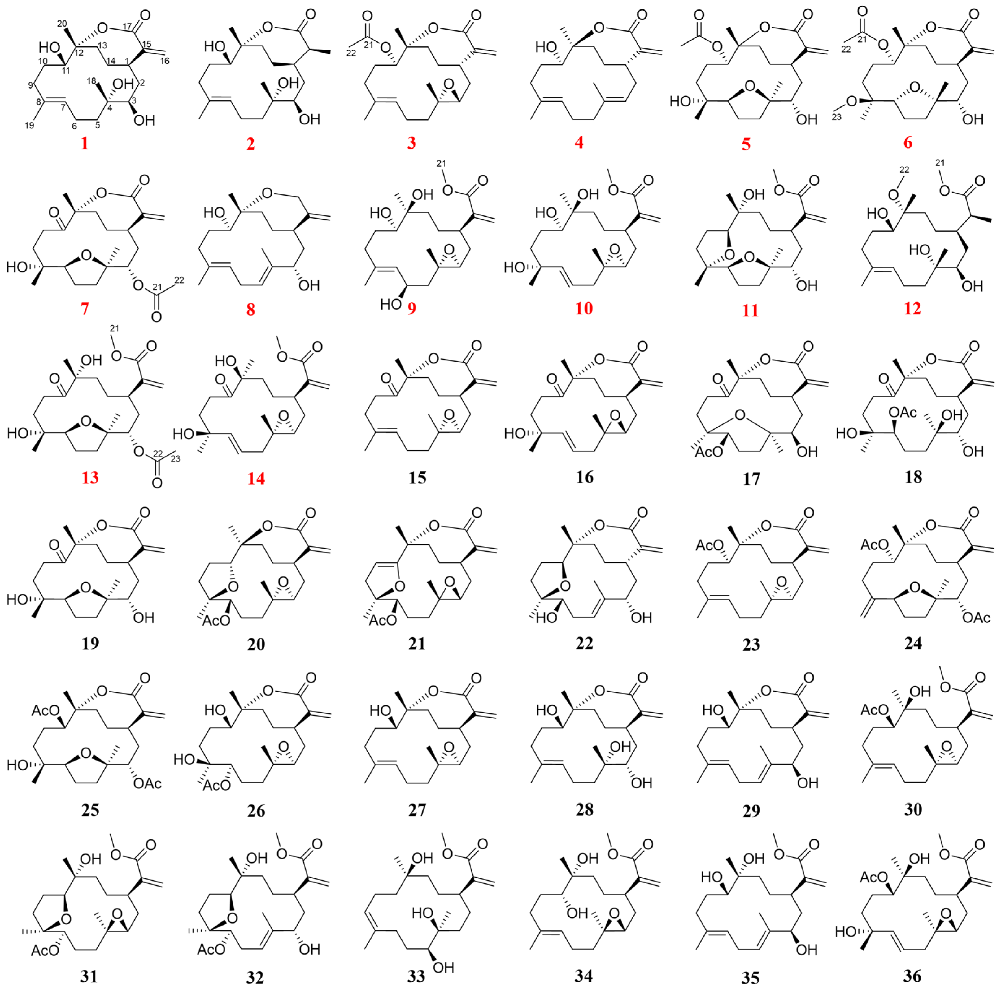 - Zhang, N.; Xu, W.; Yan, Y.; Chen, M.; Li, H.; Chen, L. Cembrane diterpenoids: Chemistry and pharmacological activities. Phytochemistry 2023, 212, 113703. [Google Scholar] [CrossRef] [PubMed]