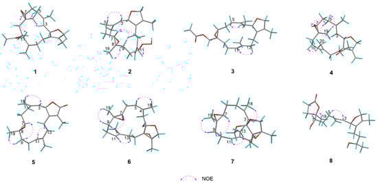 The biological sample of Lobophytum crassum was extracted with acetone, and the extract was further distributed between ether and water. The obtained ether layer was subjected to repeated column chromatography, including silica gel, Sephadex LH-20 gel, and reversed-phase HPLC, leading to the isolation of 12 compounds (1–12) (Figure 2). Among them, compounds 9–12 were rapidly identified as previously reported known compounds 13-acetoxysarcophytoxide (9) [15], (+)-laevigatol B (10, +3.4 (c 0.2, CH2Cl2)) [16], (+)-sarcophine (11, +96 (c 0.2, CHCl3)) [17], and 1,15β-epoxy-deoxysarcophine (12) [18], respectively, by comparing their NMR data and optical rotation values with those reported in the literature.