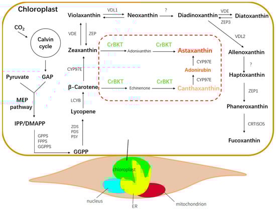 Figure 1. Schematic representation of the carotenoid biosynthetic pathway in P. tricornutum was drawn based on recent studies on fucoxanthin biosynthesis in diatoms [12] and the engineered ketocarotenoid branch introduced in this study. Endogenous enzymes are shown in black; the heterologous CrBKT introduced into the plastid is shown in green.
