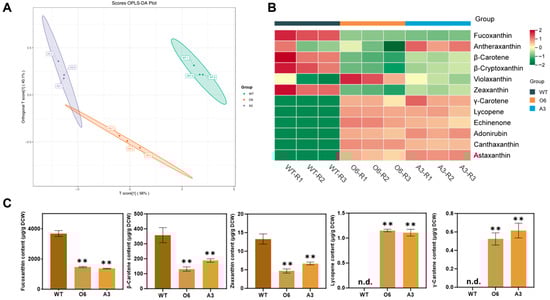 Figure 5. Global metabolomic and carotenoid pathway reprogramming in engineered P. tricornutum lines expressing CrBKT. (A) Orthogonal Partial Least Squares Discriminant Analysis (OPLS-DA) of global UPLC-MS/MS-derived metabolite profiles from wild-type (WT) and engineered strains (O6, A3). Each dot represents a biological replicate. (B) Heatmap of 12 representative carotenoids and intermediates across all samples. (C) Absolute quantification of key carotenoids: fucoxanthin, β-carotene, zeaxanthin, lycopene and γ-carotene. Data represent mean ± SD (n = 3). Statistical significance was assessed by one-way ANOVA with Tukey’s post hoc test: p < 0.01 (**), “n.d.” indicates not detected. Detailed quantitative values and full statistical analysis are provided in Supplementary Tables S2 and S3.