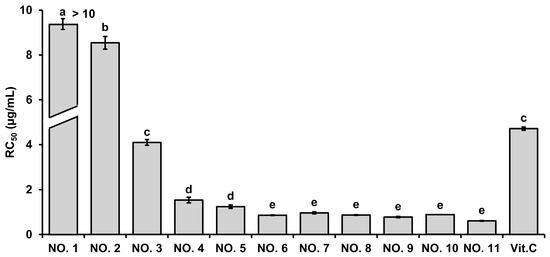 The antioxidant potential of H. pluvialis extract, walnut shell extract, and their mixtures was evaluated by the ABTS radical scavenging assay, and the results are expressed in terms of RC50 values (Figure 1). The H. pluvialis extract alone (NO. 1) showed negligible scavenging activity, with an RC50 value exceeding 10 μg/mL, indicating poor efficacy. To clearly reflect this in the visualization, the NO. 1 bar in Figure 1 is truncated, and the actual value (>10 μg/mL) is annotated above the bar. In contrast, walnut shell extract alone (NO. 11) exhibited potent activity, with an RC50 value of 0.61 ± 0.14 μg/mL. Interestingly, mixtures of H. pluvialis and walnut shell extracts showed a ratio-dependent enhancement of antioxidant activity. Formulations containing ≥ 30% walnut shell extract (NO. 4–NO. 11) displayed markedly lower RC50 values (0.61–1.53 μg/mL), indicating strong radical scavenging capacity. Among them, NO. 6–NO. 10 (ratios 5:5 to 1:9) demonstrated the most potent effects, with RC50 values significantly lower than that of vitamin C (4.72 ± 0.25 μg/mL, positive control), confirming superior antioxidant efficacy (p < 0.05).