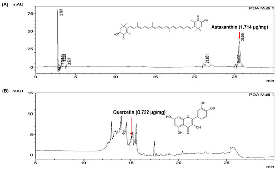 Quantitative HPLC analysis was conducted to determine the levels of the marker compounds in the optimized extract mixture (NO. 5; H. pluvialis/walnut shell = 6:4, w/w). As shown in Figure 3, distinct peaks corresponding to astaxanthin and quercetin were identified in the chromatograms of the mixed extract. The astaxanthin peak was detected at a retention time of 25.53 min at 474 nm (Figure 3A), and the quercetin peak appeared at 14.87 min at 334 nm (Figure 3B). The contents of astaxanthin and quercetin in the mixture were quantified as 1.714 μg/mg and 0.722 μg/mg, respectively.