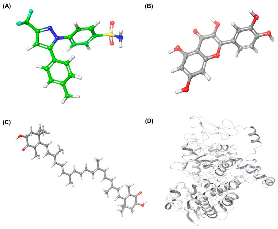 Prepared structures used for molecular docking. (A) Celecoxib, (B) Quercetin, (C) Astaxanthin, and (D) the optimized COX-2 protein (PDB ID: 3LN1) generated using the Protein Preparation Wizard in Schrödinger.