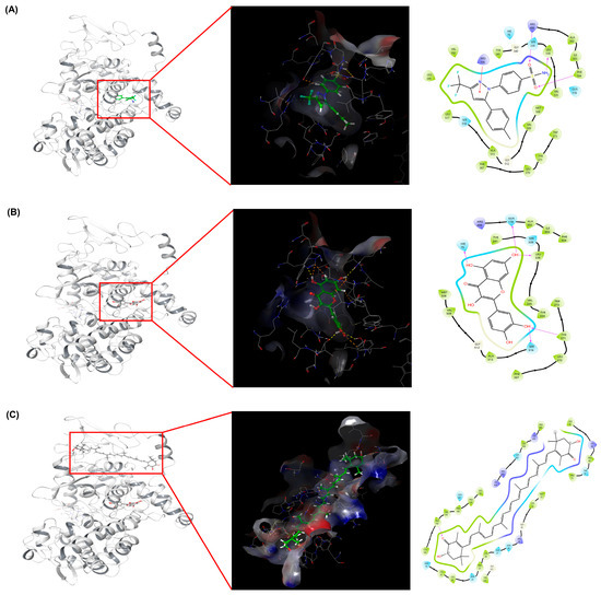 Binding interaction analysis of COX-2 with docked ligands. Overall 3D and 2D representations of the best docking poses showing the binding conformations of (A) celecoxib, (B) quercetin, and (C) astaxanthin within the COX-2 binding pocket. Each panel illustrates (left) the overall protein structure highlighting the ligand-binding region, (middle) the 3D interaction map depicting hydrophobic and polar surface contacts, and (right) the 2D schematic representation of hydrogen bonds and hydrophobic interactions with key amino acid residues.
