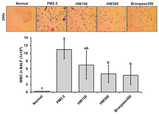 Effects of HW extracts on total WBC counts in BALF of PM2.5-induced pulmonary inflammation in mice. Representative microscopic images (200× magnification) showing inflammatory cell infiltration in BALF from each group (Normal, PM2.5, HW150, HW300, and Bronpass300). Values are expressed as mean ± SD (n = 5). Different letters (a–c) above the bars indicate statistically significant differences at p < 0.05 according to one-way ANOVA followed by Tukey’s post hoc test. Enlarged high-resolution images of panels are provided in Supplementary Figure S1.