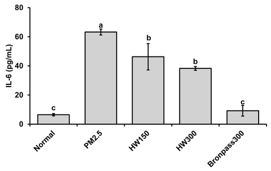 Effects of HW extracts on IL-6 levels in serum of PM2.5-induced pulmonary inflammation in mice. Values are expressed as mean ± SD (n = 5). Different letters (a–c) above the bars indicate statistically significant differences at p < 0.05 according to one-way ANOVA followed by Tukey’s post hoc test.