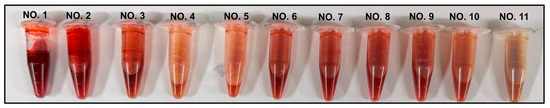 Representative images of extract mixtures of H. pluvialis and walnut shell at different mixing ratios (10:0 to 0:10, w/w). Sample numbers correspond to NO. 1–NO. 11, as shown from left to right.