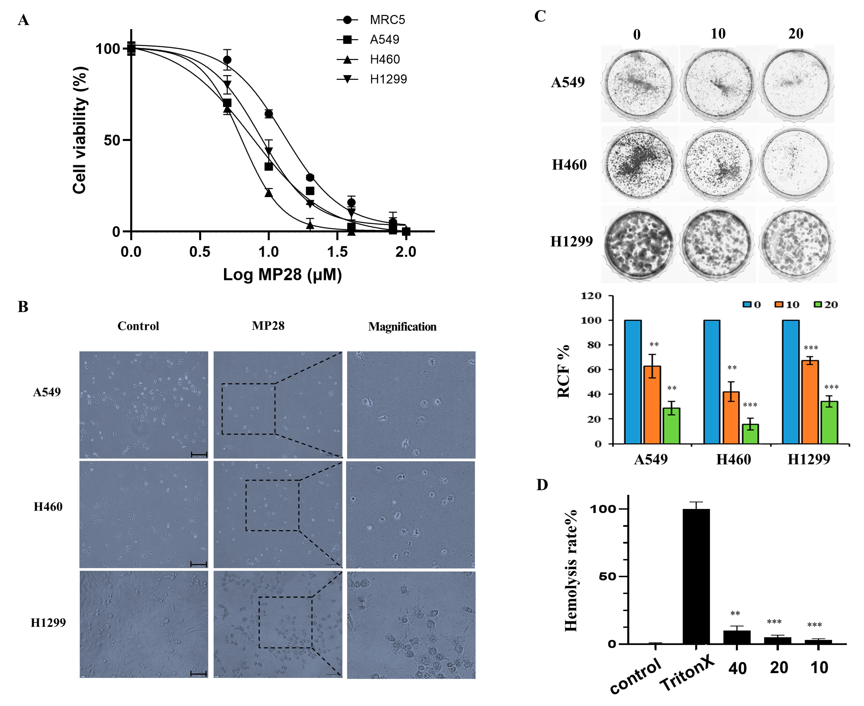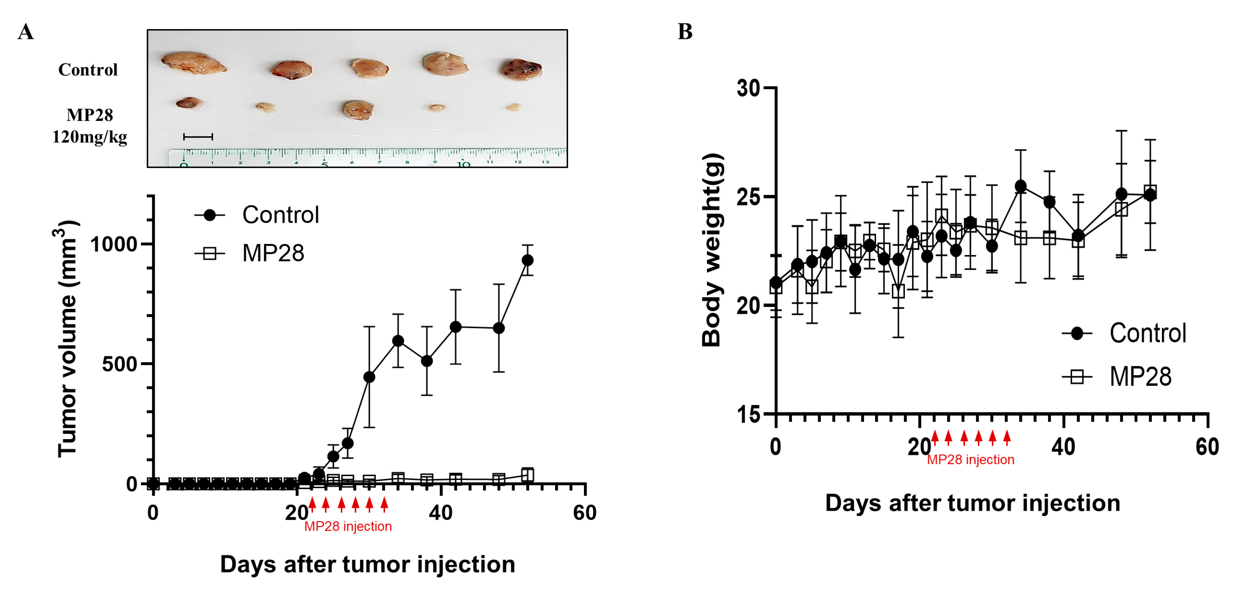 2.5. In Vivo Antitumor Effect and Safety of MP28