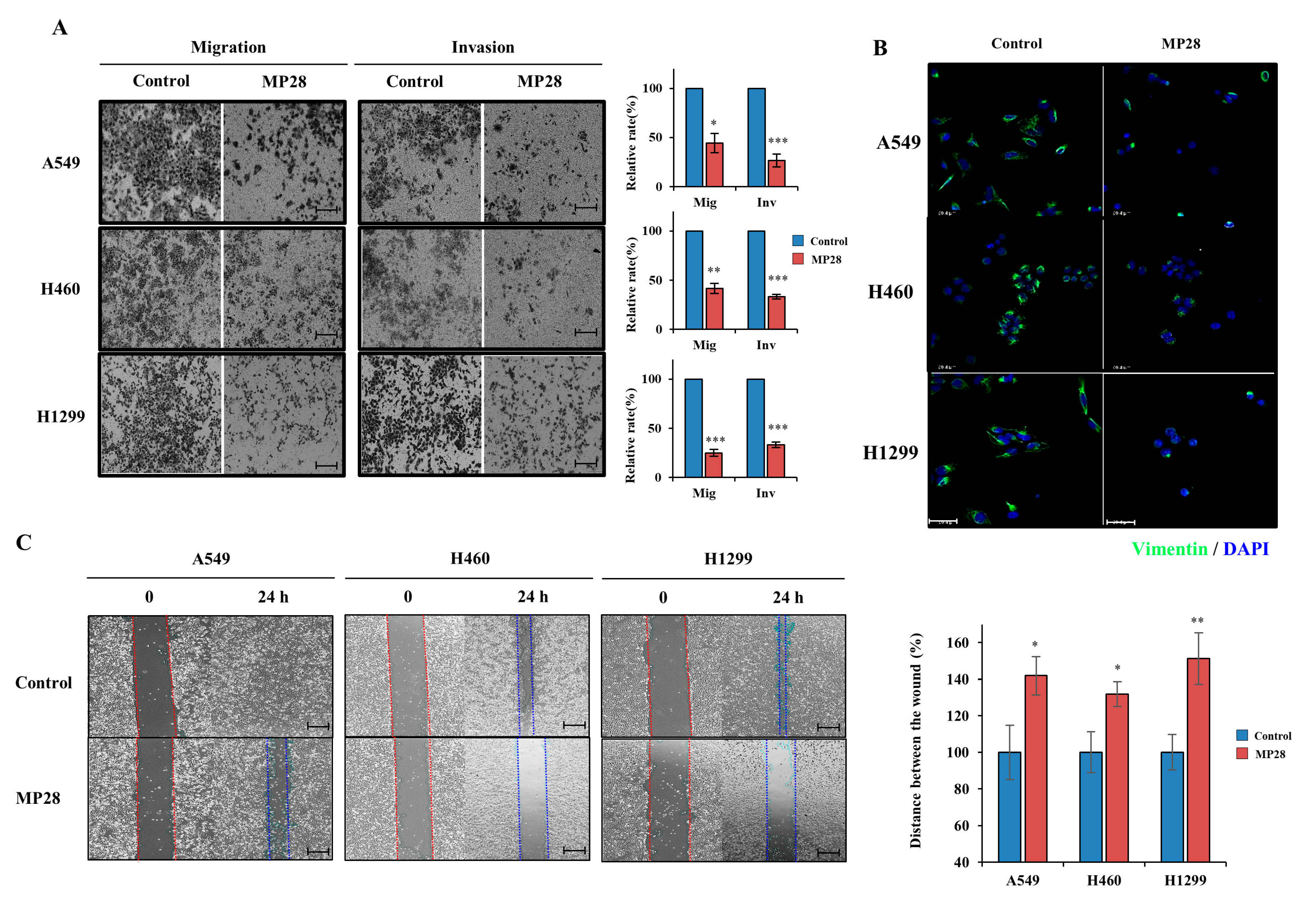 2.3. Regulation of Epithelial–Mesenchymal Transition (EMT) on MP28