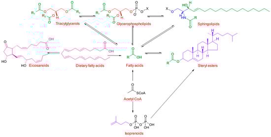 The diversity and interconnectedness of the major biogenic lipid classes. R, derived from radical, represents an alkyl group, and R-C=O (in green), an acyl group in which the total carbon chain length usually ranges from 14 to 24. Fatty acids and sterols are synthesized from the 2-carbon precursor, acetyl CoA, or are acquired dietarily. Sterols are built up from 5-carbon isoprene units (in purple). Fatty acids are esterified with glycerol (in red) in glycerolipids (the triacylglycerols and glycerophospholipids), and with sterols to form cholesteryl esters in this case. They are also transferred to be part of sphingolipids containing a serine derived group (in blue). Glycerophospholipids and sphingolipids are important membrane components, and the substituent X represents an organic base, acid or alcohol as part of the polar headgroup. Eicosanoid bioactive compounds are derived from 20-carbon precursors (eikosi is Greek for 20), in this case eicosapentaenoic acid (in magenta). This figure and legend are based on those appearing in Quehenberger et al. [10] and McDonald et al. [11].