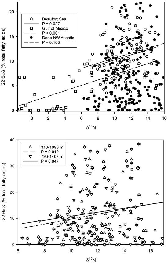 Trophic magnification of DHA in marine food webs from three very different environments: the Beaufort Sea Shelf [92], the southwest Gulf of Mexico [94] and the continental margin in the northwest Atlantic [95]. DHA proportions are plotted against bulk nitrogen stable isotope ratios (δ15N) as a proxy for trophic position. The bottom panel shows two separate significant regressions according to depth in the northwest Atlantic on a different scale.