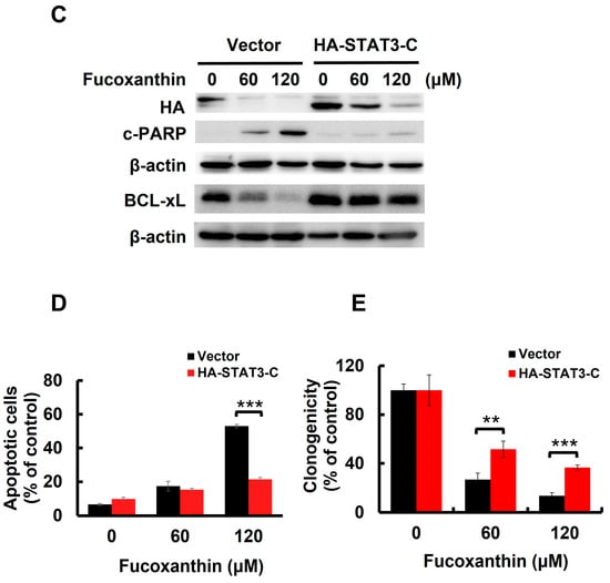 Blockade of STAT3 activation accounts for Fucoxanthin’s proapoptotic and cytotoxic effects on human bladder TCC cells. (A) Fucoxanthin inhibits constitutively active STAT3. TCCSUP and T24 cells after 24 h treatment with Fucoxanthin (0, 60, 120 μM) were subjected to immunoblotting for the levels of active STAT3, revealed by Tyr 705 phosphorylation (p-STAT3 (Tyr 705)), and the levels of BCL-xL, a well-known STAT3 transcriptional target. (B) Fucoxanthin inhibits IL-6-induced activation of STAT3. TCCSUP and T24 cells were stimulated with IL-6 (100 ng/mL) for 30 min, followed by 24 h treatment with Fucoxanthin and then immunoblotting for p-STAT3 (Tyr 705) levels. (C) Ectopic expression of STAT3-C, a dominant-active mutant of STAT3, abolished Fucoxanthin-induced PARP cleavage and BCL-xL downregulation. The vector control and STAT3-C stable clones of T24 cells were treated with Fucoxanthin for 24 h, followed by gauging the levels of c-PARP and BCL-xL using immunoblotting. (D) Fucoxanthin failed to enhance annexin V-positive cell population levels of T24 STAT3-C stable clones. The annexin V-stained cells were determined using flow cytometry analysis. (E) Fucoxanthin was ineffective in blocking T24 STAT3-C stable clones to form colonies revealed by clonogenicity assay. All immunoblotting used the levels of β-actin as a control for equal loading. **: p < 0.01; ***: p < 0.001.
