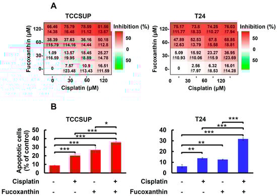In Figure 1A, we showed that TCCSUP and T24 cells were refractory to Cisplatin treatment, with over 80% of cells still alive even with the drug dosages reaching 200 μM. Accordingly, we aimed to test whether co-treatment with Fucoxanthin sensitizes bladder TCC cells to the cytotoxic effects of Cisplatin. Our findings revealed that treating TCCSUP cells with either Fucoxanthin (60 μM) or Cisplatin (120 μM) alone for 24 h inhibited cell viability by 38.39 ± 15.79% or 16.51 ± 11.59% of the drug-free control, respectively. However, when the two treatments were combined, Fucoxanthin markedly potentiated Cisplatin’s efficacy, increasing cell viability inhibition to 50.18 ± 12.80% (Figure 5A, left). For T24 cells, the effect of Cisplatin (60 μM) on cell viability was drastically enhanced from 6.32 ± 8.53% when applied alone to 67.80 ± 5.58% when co-treated with Fucoxanthin (60 μM) (Figure 5A, right). Notably, the increased levels of cell viability inhibition observed with the combination of Fucoxanthin and Cisplatin coincided with elevated rates of apoptotic cell death (Figure 5B). Together, these findings underscore the significant potential of Fucoxanthin to enhance the susceptibility of human bladder TCC cells to Cisplatin-induced cytotoxicity, primarily through the induction of apoptosis.