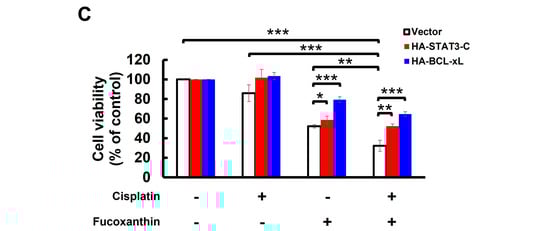 Considering Fucoxanthin’s inhibitory effect on STAT3 activation (refer to Figure 3) and the potent antiapoptotic action of STAT3 signaling, we aimed to decipher the role of STAT3 signaling in Fucoxanthin-facilitated Cisplatin sensitization. To this end, T24 cells stably expressing STAT3-C were treated for 24 h with Cisplatin (60 μM), Fucoxanthin (60 μM), or a combination of Cisplatin (60 μM) with Fucoxanthin (60 μM), followed by determining cell viability under these treatment conditions. We found that cell viability was significantly decreased following combination treatments, in contrast to treatments with either drug alone (p < 0.001) (Figure 5C, white bars). Notably, the enhancement of Cisplatin cytotoxicity by Fucoxanthin was abrogated in the STAT3-C stable clones (p < 0.01) (Figure 5C, red bars). Likewise, Fucoxanthin failed to sensitize Cisplatin in T24 cells overexpressing BCL-xL (p < 0.001) (Figure 5C, blue bars). Together, these findings argued that inhibiting the STAT3/BCL-xL axis accounts for the mechanism whereby Fucoxanthin facilitates Cisplatin sensitization.