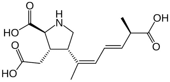 Domoic acid is a polar, hydrophilic, excitatory amino acid (EAA) that is similar in biochemical structure and function to kainic acid (KA), L-aspartate, and L-glutamate [1,81] (Figure 2). Kainic acid is a biotoxin naturally produced by a macroalgae [82]. L-aspartate and L-glutamate are excitatory neurotransmitters in vertebrates, but L-glutamate is dominant. Both DA and KA can bind to glutamate receptors (GluRs) and mimic glutamate’s biological activity [83,84]. However, DA is three times more potent than KA and up to 100× more potent than L-glutamate [85]. Though there are about a dozen known DA isomers with variable potency, isomers are not considered a substantial threat to humans and marine wildlife due to their lower GluR affinity and environmental concentrations [19,25].