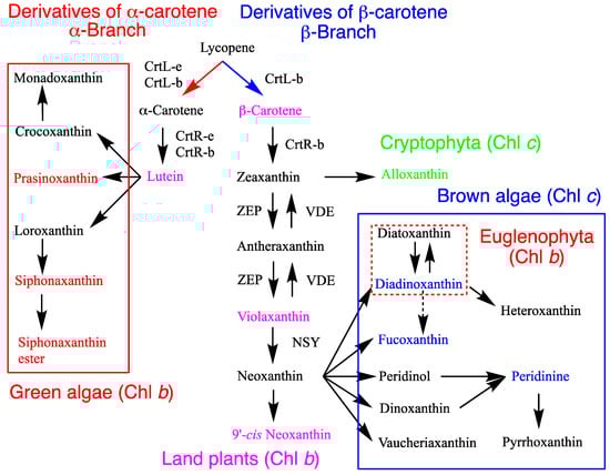 Major carotenoids in brown algae, including Heterokontophyta, Haptophyta, and Dinophyta, are β-carotene, zeaxanthin, diadinoxanthin, fucoxanthin, and peridinin, depending on the divisions and classes. Notably, the α-branch carotenoids are absent. Little is known regarding the carotenogenesis pathways of brown algae; however, some have been proposed based on the chemical structures of the carotenoids present, and the functions of some enzymes have been confirmed as below (Table 1, Figure 2).