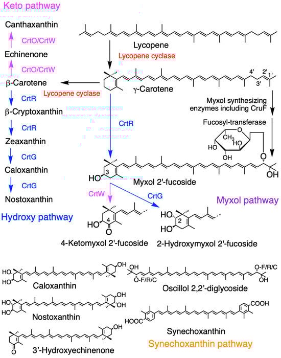 The pathways and the enzymes involved in the production of the right half structure of myxol 2′-methylpentoside remain unclear (Figure 3, myxol synthesizing enzymes in myxol pathway) [2,14]; however, two enzymes from Synechococcus sp. PCC 7002 have been functionally confirmed: carotene 1′,2′-hydratase (CruF), and glycosyltransferase (CruG) [87].