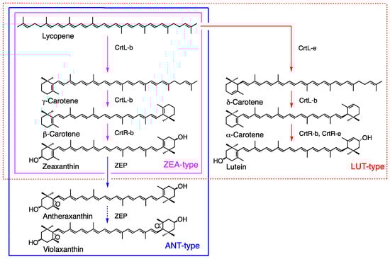 Red algae (Rhodophyta) produce a wide variety of carotenoids and may be categorized into three types based on carotenoid composition and phylogenetics, including the ZEA-type (Figure 4, magenta line), ANT-type (blue line), and LUT-type (red line) as described in Section 2 (Table 1) [15,29]. The major carotenoids of the ZEA-type are β-carotene and zeaxanthin, and this type contains homologous genes, such as CrtL-b and CrtR-b, which are involved in zeaxanthin synthesis. The ANT-type includes antheraxanthin in addition to the ZEA-type and features the enzyme of zeaxanthin epoxidase ZEP for antheraxanthin synthesis, whose function is confirmed in Madagascaria erythrocladioides [90]. Antheraxanthin is the major carotenoid, whereas violaxanthin is either absent or present in minor amounts, and it may have an important role in photosynthesis. The LUT-type is characterized by the presence of α-carotene and lutein and includes CrtL-e and CrtR-e for lutein biosynthesis (Figure 4). The function of the P450-type β-carotene hydroxylase (CYP97) has been confirmed in Porphyra umbilicalis [91].