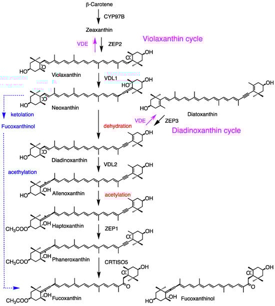 Figure 5. Carotenogenesis pathway from β-carotene to fucoxanthin, as well as violaxanthin and diadinoxanthin cycles in the brown alga Phaeodactylum tricornutum. VDE is activated by high-light conditions. The dotted blue line highlights a simple pathway (Figure 1). The illustrated structures of fucoxanthin and fucoxanthinol are reversed for the right and left sides according to the IUPAC-IUB semi-systematic rule.