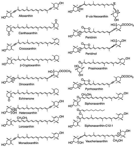 Carotenoids contain several unique functional groups. The allene group (C=C=C) is a unique structure in natural products and is primarily found in carotenoids [11], such as fucoxanthin in brown algae and diatoms, peridinin only in Dinophyta, and 9′-cis neoxanthin in green algae, Chlorarachniophyta, and land plants. The acetylene group (C≡C) is a unique structure, and acetylenic carotenoids occur only in algae, such as alloxanthin, crocoxanthin, and monadoxanthin in Cryptophyta, as well as diadinoxanthin and diatoxanthin in Heterokontophyta, Haptophyta, Dinophyta, and Euglenophyta. Acetylated carotenoids (-O-CO-CH3), such as fucoxanthin, peridinin, and dinoxanthin, are also primally found in algae, such as Heterokontophyta, Haptophyta, and Dinophyta. These carotenoids are specific to certain algal divisions and classes (Table 1) based on our findings [2,3,4,12,13,14,15] and others [1,6,7,8,9,16,17,18]. The structures of important carotenoids are illustrated in the figures of this review.