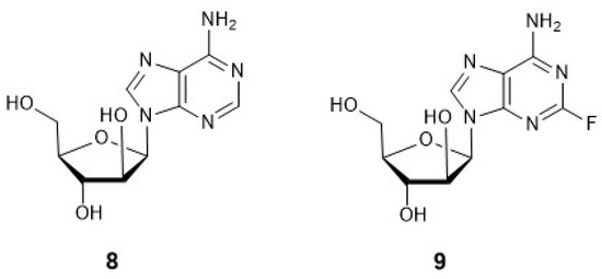 Vidarabine, 9-β-D-Arabinofuranosyladenine (ara-A) (8) together with Cytarabine (ara-C) (1) and protamine sulfate, was one of the first compounds of marine origin to be used in clinical use and was formally approved by the US FDA in 1976 as an ophthalmic ointment [71]. Although it was initially considered antiviral and even tested for its anticancer effect [72], its clinical use was ruled out as the therapeutically active concentration of the drug was not reached due to its relatively low solubility and high body clearance. In fact, the drug is rapidly deaminated to its inactive arabinosyl hypoxanthine form by adenosine deaminase, restricting its clinical use to limited pathological conditions [73,74]. In order to avoid adenosine deaminase mediated deactivation, Vidarabine (8) was initially replaced by Fludarabine (9) which carries, in addition, a fluorine at 2-position of the adenine (Figure 1) [75].