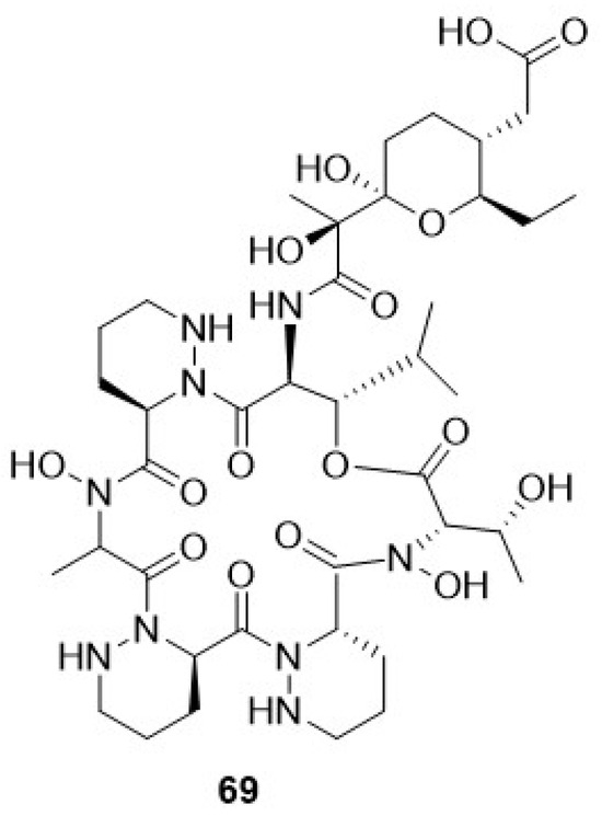 Plitidepsin (21) or Dehydrodidemnin B, marketed by PharmaMar (Madrid, Spain) under the trade name Aplidin®, is a cyclic depsipeptide, i.e., a cyclic peptide with one or more ester bonds instead of peptide bonds, which was first isolated from a Mediterranean marine tunicate (Aplidium albicans). Aplidin exhibits antiviral, immunosuppressive, and antitumor properties [85] and has been shown to induce apoptosis of leukemia cell by interruption of the cell cycle at the G1 and G2/M phases [86].