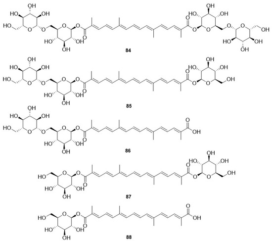 - Moraga, A.R.; Nohales, P.F.; Pérez, J.A.F.; Gómez-Gómez, L. Glucosylation of the Saffron Apocarotenoid Crocetin by a Glucosyltransferase Isolated from Crocus sativus Stigmas. Planta 2004, 219, 955–966. [Google Scholar] [CrossRef]
