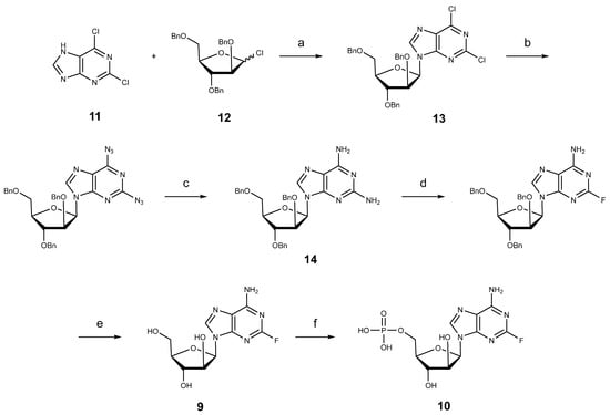 Synthesis of Fludarabine (9) and Fludarabine-5-monophosphate (10). Reagents and conditions: (a) Hg(CN)2, CaSO4, MeNO2, reflux, 3 h, 11%; (b) NaN3, EtOH, H2O, 1 h, 98%; (c) Pd/C, H2, EtOH, rt, 6 h, 75%; (d) HBF4, NaNO2, CHCl3, −10 °C, 40 min, 36%; (e) Na, NH3, 34%; (f) POCl3, PO(OEt)3, 0 °C, 3.5 h, 96% [81].