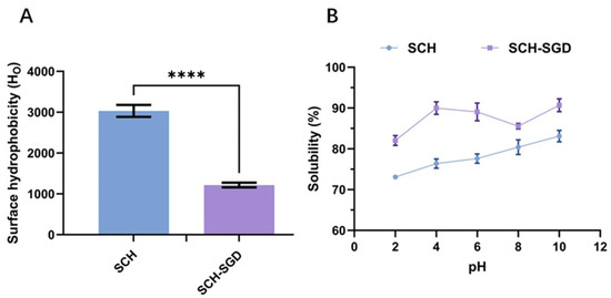 Surface hydrophobicity and solubility of SCH and SCH-SGD. (A) Surface hydrophobicity; (B) Solubility. **** p < 0.0001.