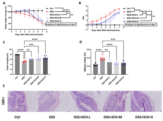Effects of SCH administration on symptoms of DSS-induced colitis in mice. (A) Body weight change; (B) DAI scores; (C) Colon length; (D) Spleen index; (E) HE staining of the distal colon (magnification of 100×). * p < 0.05, ** p < 0.01, *** p < 0.001, **** p < 0.0001.