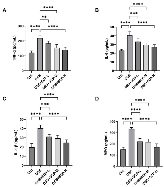 The role of pro-inflammatory cytokines has been extensively studied, and their dysregulation is believed to play a significant role in the pathogenesis of IBD [17]. IL-1β, the prototypical pro-inflammatory cytokine belonging to the IL-1 family, is a central player in IBD pathogenesis. TNF-α and IL-6, which contribute to the intestinal inflammatory process, are also major cytokines involved in IBD pathogenesis [18,19,20]. In our study, serum levels of TNF-α, IL-6, and IL-1β were examined in mice. The levels of TNF-α, IL-6, and IL-1β were significantly increased in the DSS group compared to the control group (p < 0.0001), with increases of 56.57%, 50.55%, and 72.92%, respectively. However, a trend of dose-dependent decrease in all three pro-inflammatory factors was observed following SCH treatment (Figure 3A–C). In addition, we assessed the activity of MPO in the colon tissues, with results presented in Figure 3D. MPO activity, a key indicator of neutrophil infiltration [21], was significantly elevated in the DSS group. Natural zinc-enriched oyster peptide significantly reduced MPO activity in the colonic tissues of DSS-induced colitis mice [22]. Additionally, a dose-dependent reduction in MPO activity was observed in SCH-treated mice. Notably, MPO activity decreased by 49% in the SCH-H group compared to the DSS group, suggesting that SCH inhibited the excessive proliferation of MPO-positive cells and neutrophil infiltration in the tissues.