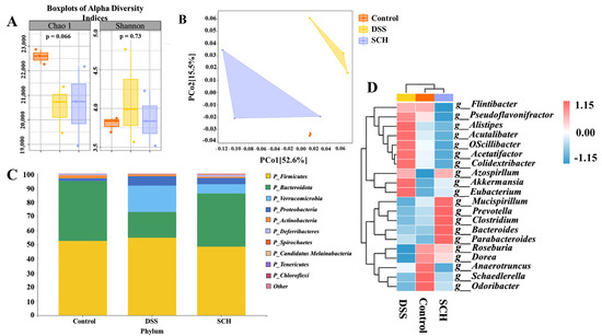 Effects of SCH administration on gut microbiota in mice with DSS-induced colitis. (A) α-diversity indices (Shannon and Chao 1 indices); (B) Principal coordinate analysis; (C) Species composition at the phylum level; (D) Heatmap of species composition at the genus level.