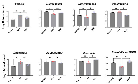 Effects of SCH administration on gut microbiota composition. Genus and species level intergroup differences species. * p < 0.05 and “ns” denotes no statistically significant difference.