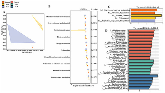 Changes in the structure of the intestinal flora are invariably accompanied by alterations in the function of the intestinal microflora. Therefore, we further investigated the functional consequences of SCH supplementation. Bray–Curtis Principal Coordinates Analysis (PCoA) based on Kyoto Encyclopedia of Genes and Genomes (KEGG) immediate homologue levels (KO) demonstrated significant separation between groups (Figure 6A). At the level of 2-level functional differences in KEGG, our results indicated that among the ten pathways most enriched for genes, the function of normal mice gut microbes was diminished in the presence of DSS. However, this trend was reversed following SCH intervention across all pathways (Figure 6B). It is important to note that not all pathways exhibited significant differences. We further employed LEfSe analysis at the three levels of KEGG function to identify four metabolic pathways, consistent with LDA > 2, which revealed that the metabolic pathways in the control group included starch and sucrose metabolism as well as atrazine degradation (Figure 6C).