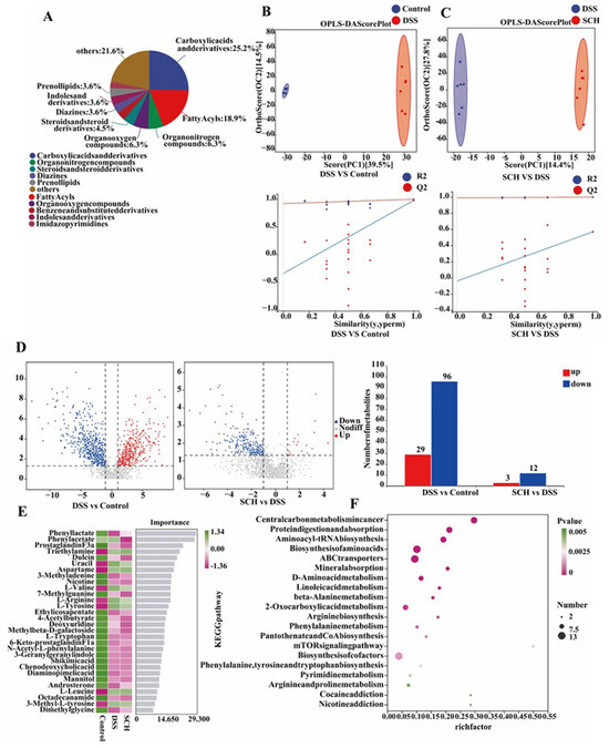 Effects of SCH administration on microbial metabolites in mice with DSS-induced colitis. (A) Percentage of each microbial metabolite; (B,C) Discriminant analysis of orthogonal projections of latent structures along with permutation tests; (D) Volcano plots highlighting differential variables and bar graphs illustrating the impact of SCH intervention on microbial metabolites in DSS-induced colitis mice; (E) Top 30 metabolites identified through machine learning analysis across the three group comparisons; (F) Pathway enrichment analysis of the three groups.