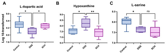 Effects of SCH administration on levels of (A) L-aspartic acid, (B) hypoxanthine, and (C) L-serine. * p < 0.05, ** p < 0.01, and “ns” denotes no statistically significant difference.